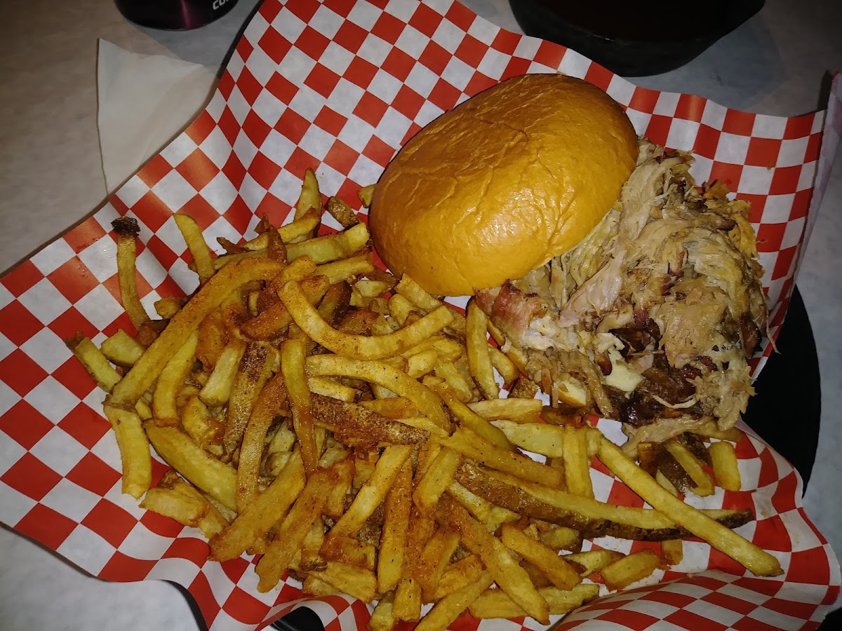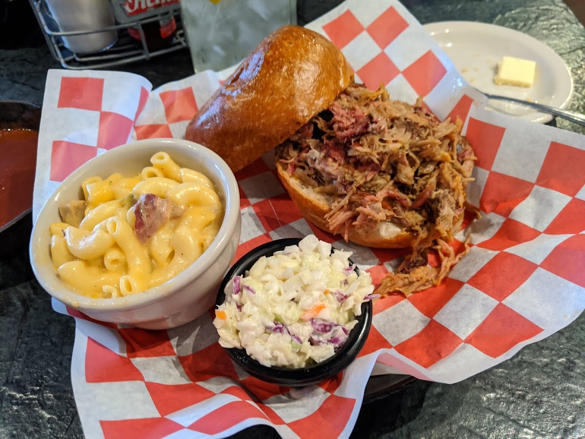 What a nice surprise! Delicious BBQ. We got the Super Sampler which includes 3 meats, 2 sides and some St Louis Ribs for $29! Alot of food! We got the pulled pork, pulled beef and brisket with green chili Mac and cheese and fried okra. The beef was a little dry but the rest was really good.